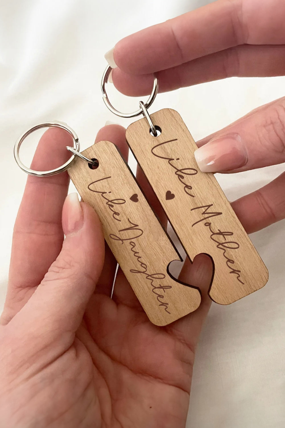 A pair of matching wooden pendants says "Like Mother" "Like Daughter"