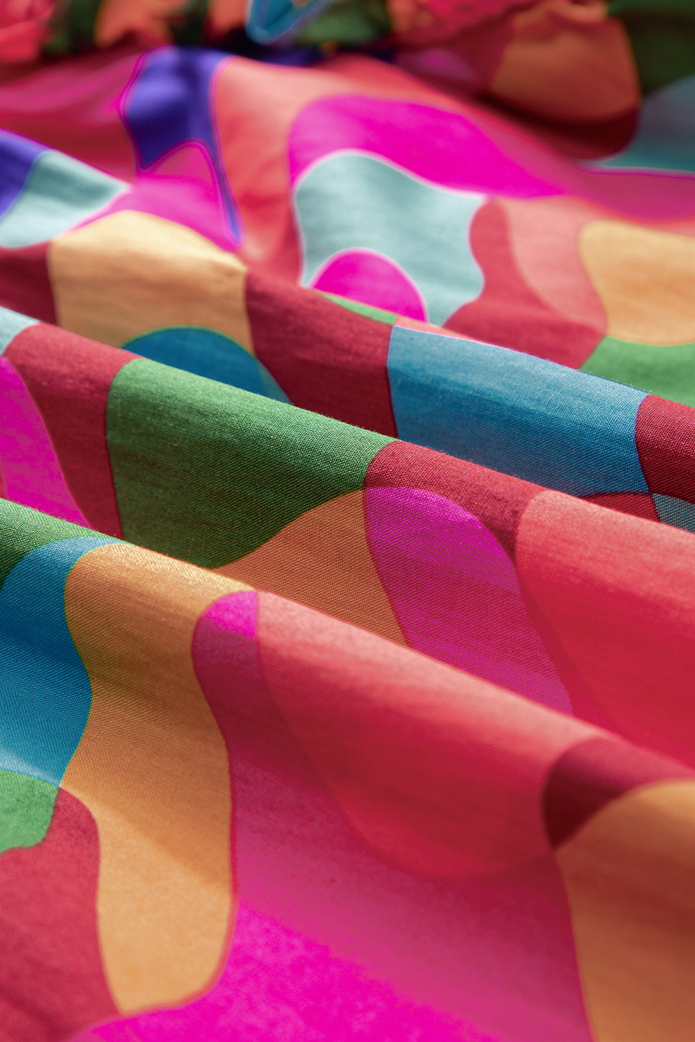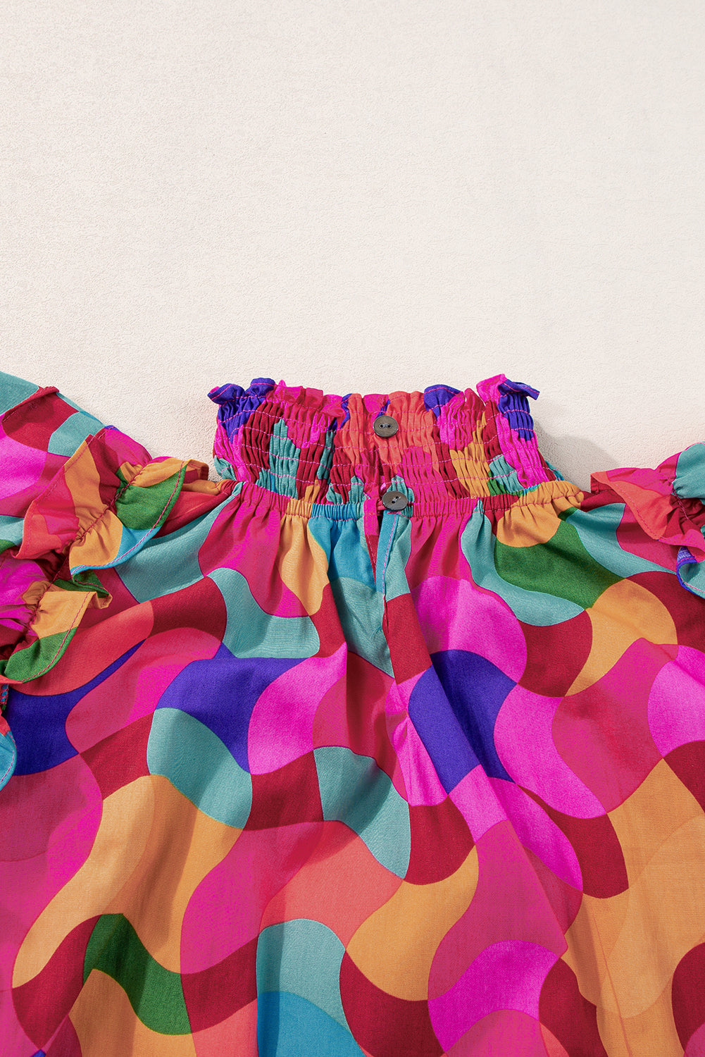 Both the abstract print and playful ruffle sleeves are eye-catching and alluring