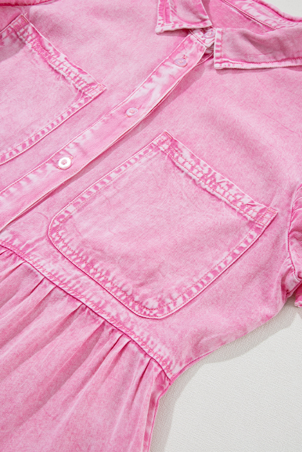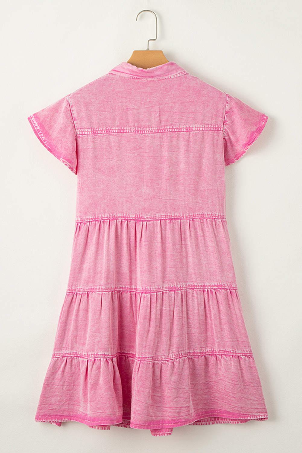 - Collared neck, button-front, tiered silhouette, pleated details, and pocketed