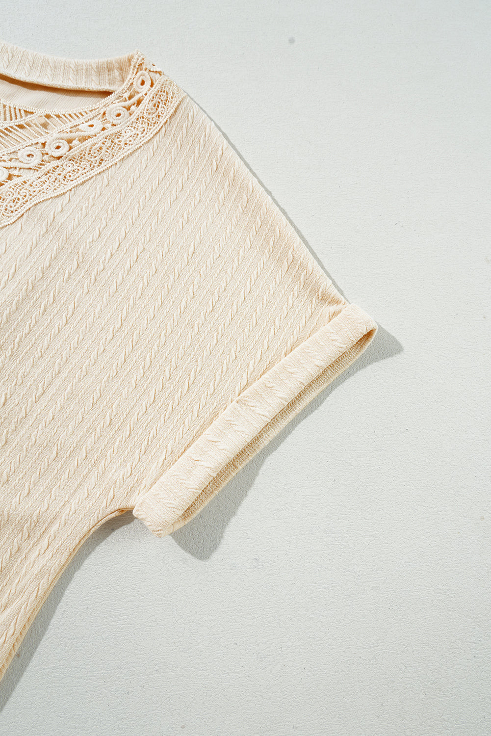 - Stylish plus size top features a delicate lace crochet patchworking.