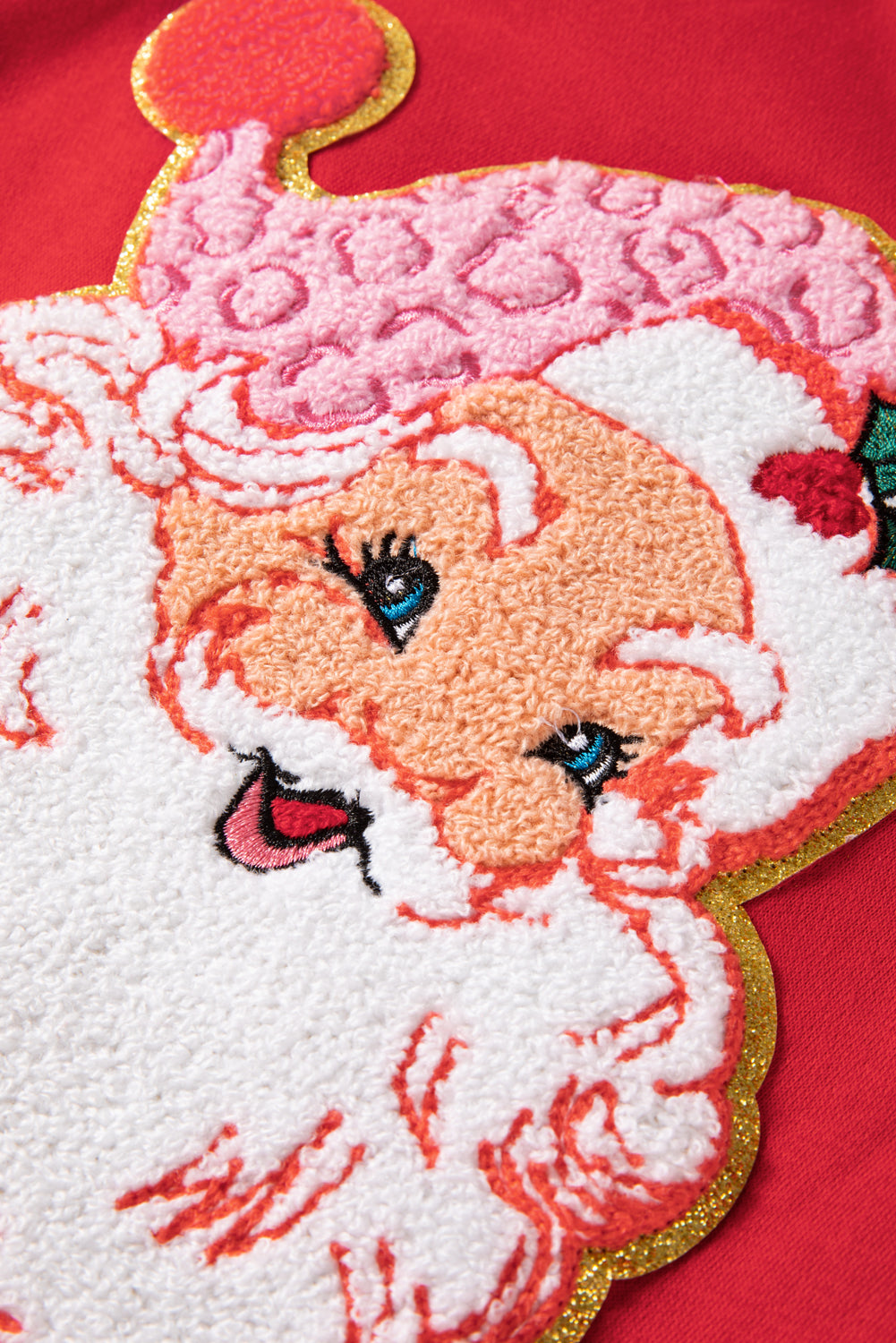 The Santa Claus graphic adds a playful touch to your holiday look.