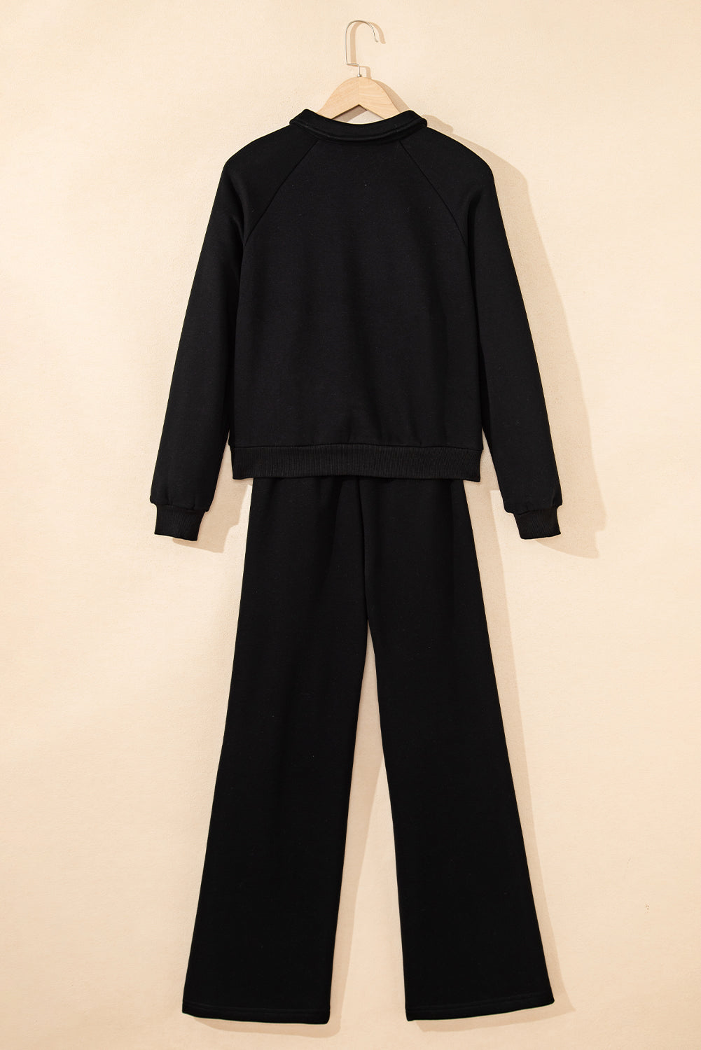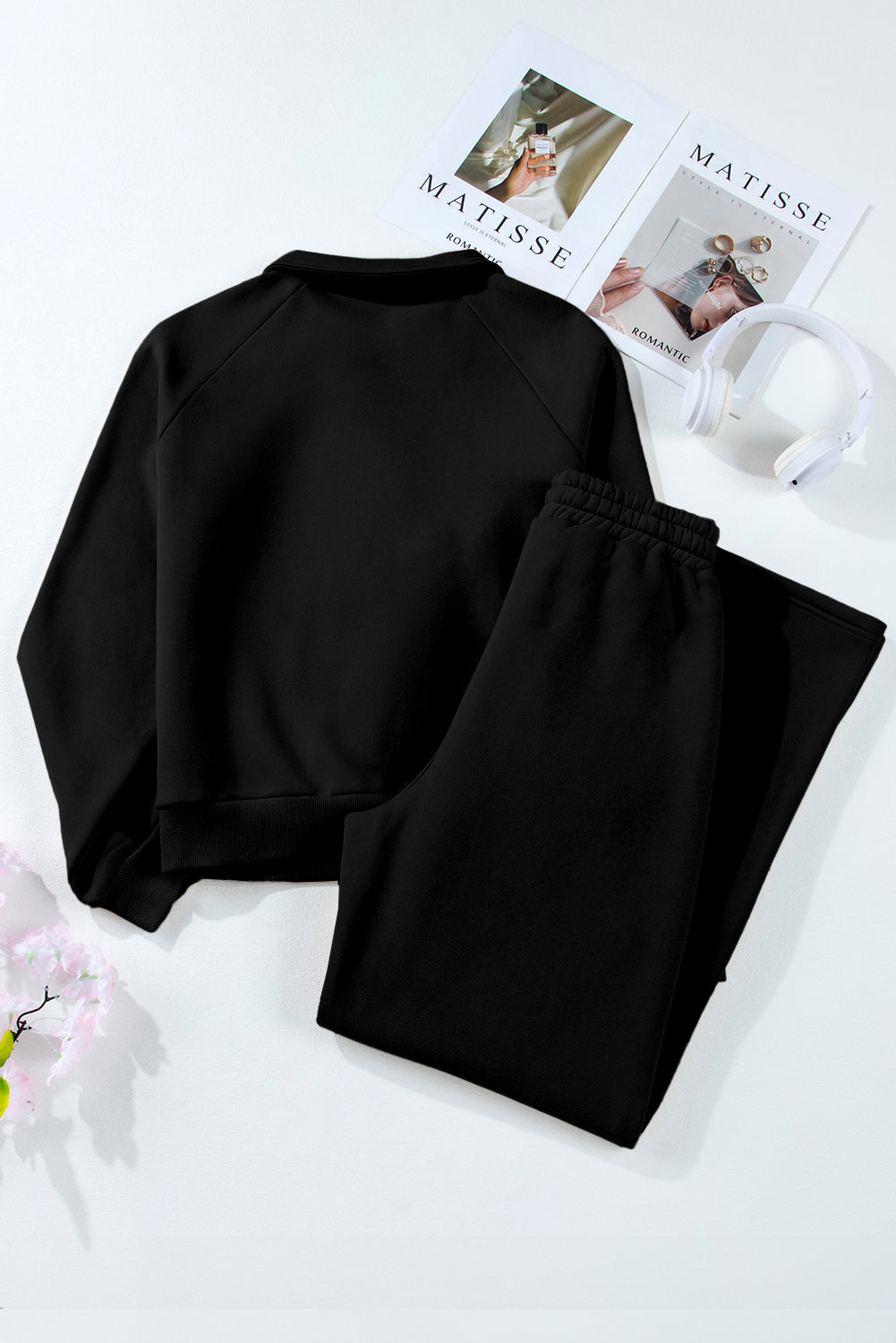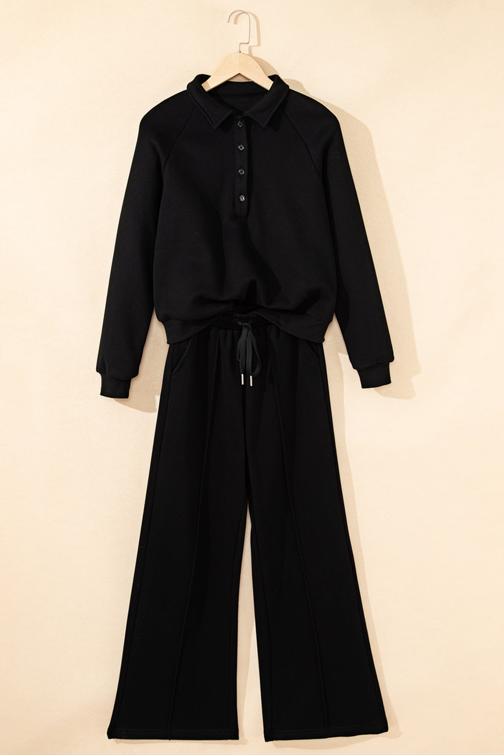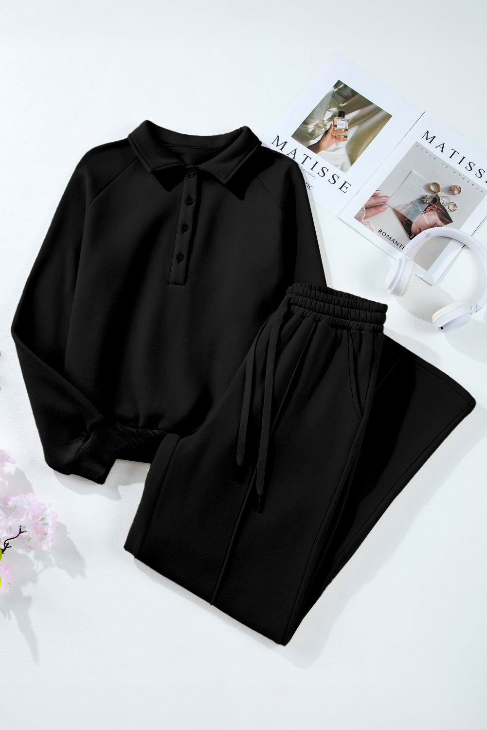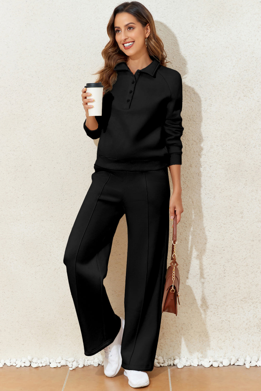 Featuring a collared pullover sweatshirt and matching jogger-style pants.