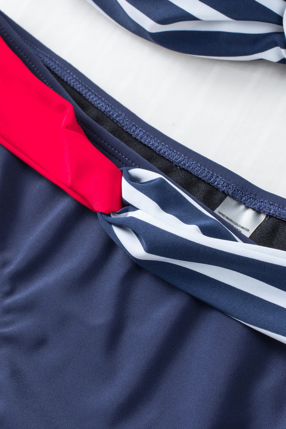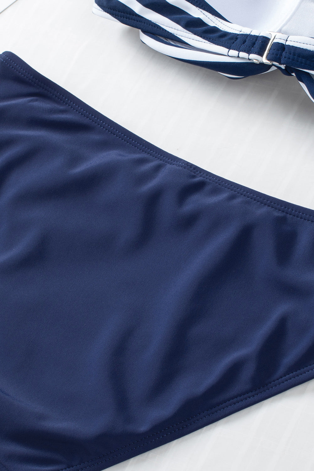 •This sexy bikini has a striped bandeau top, detachable halter strap
