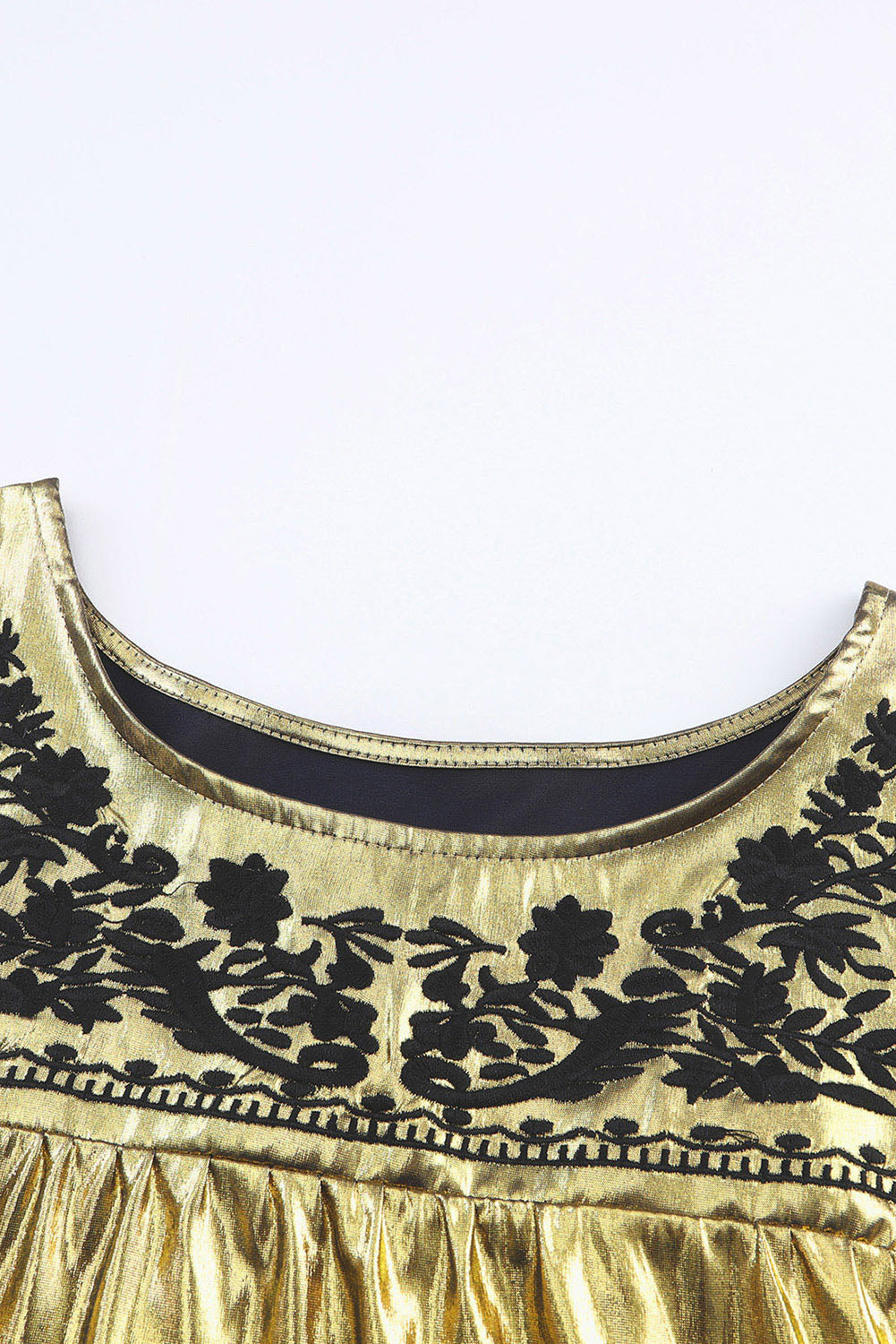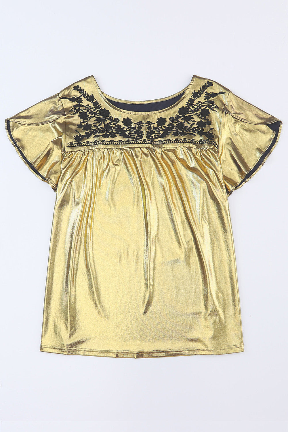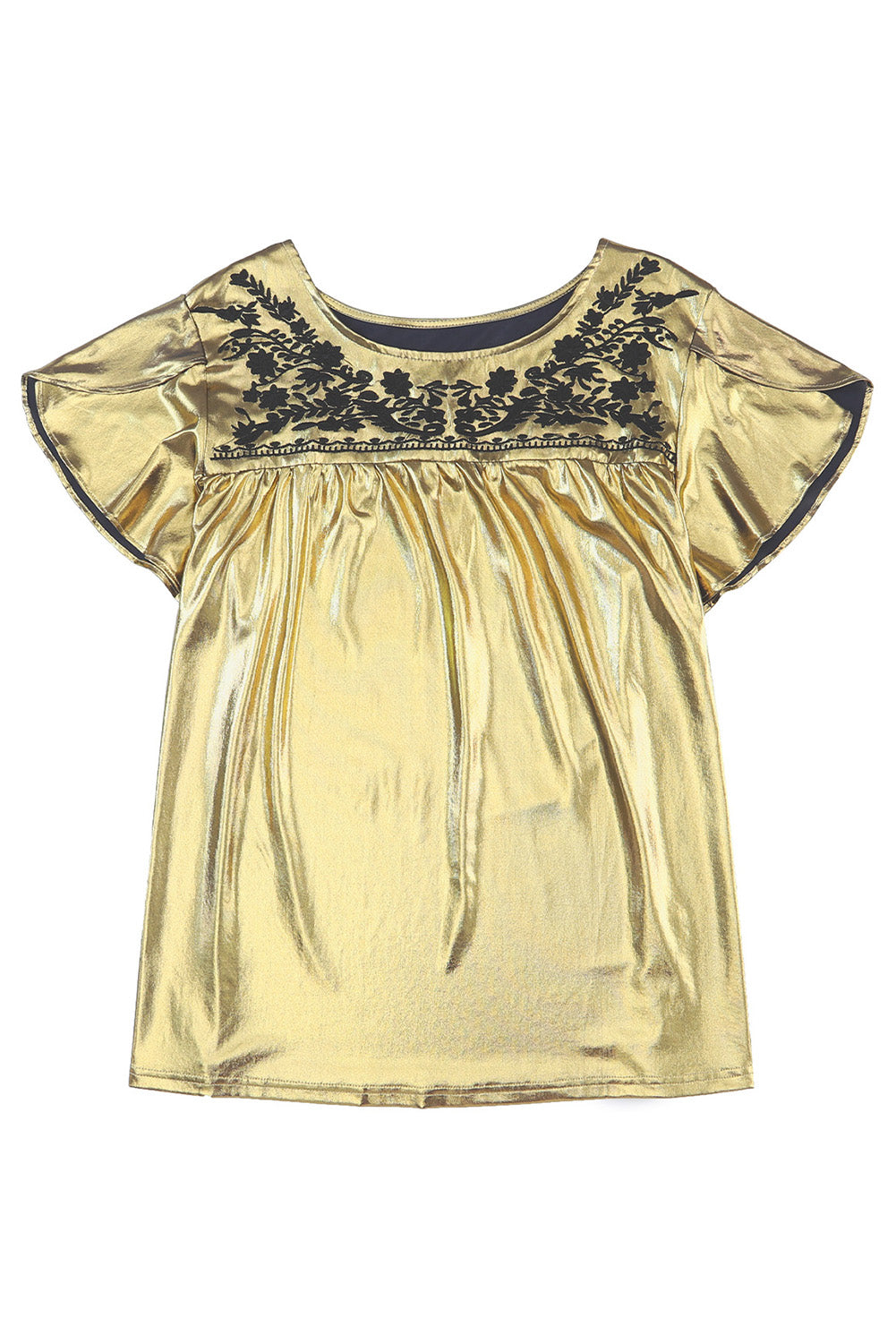 - Featured with a crew neckline, short sleeves, ruched details, embroidery, and solid color