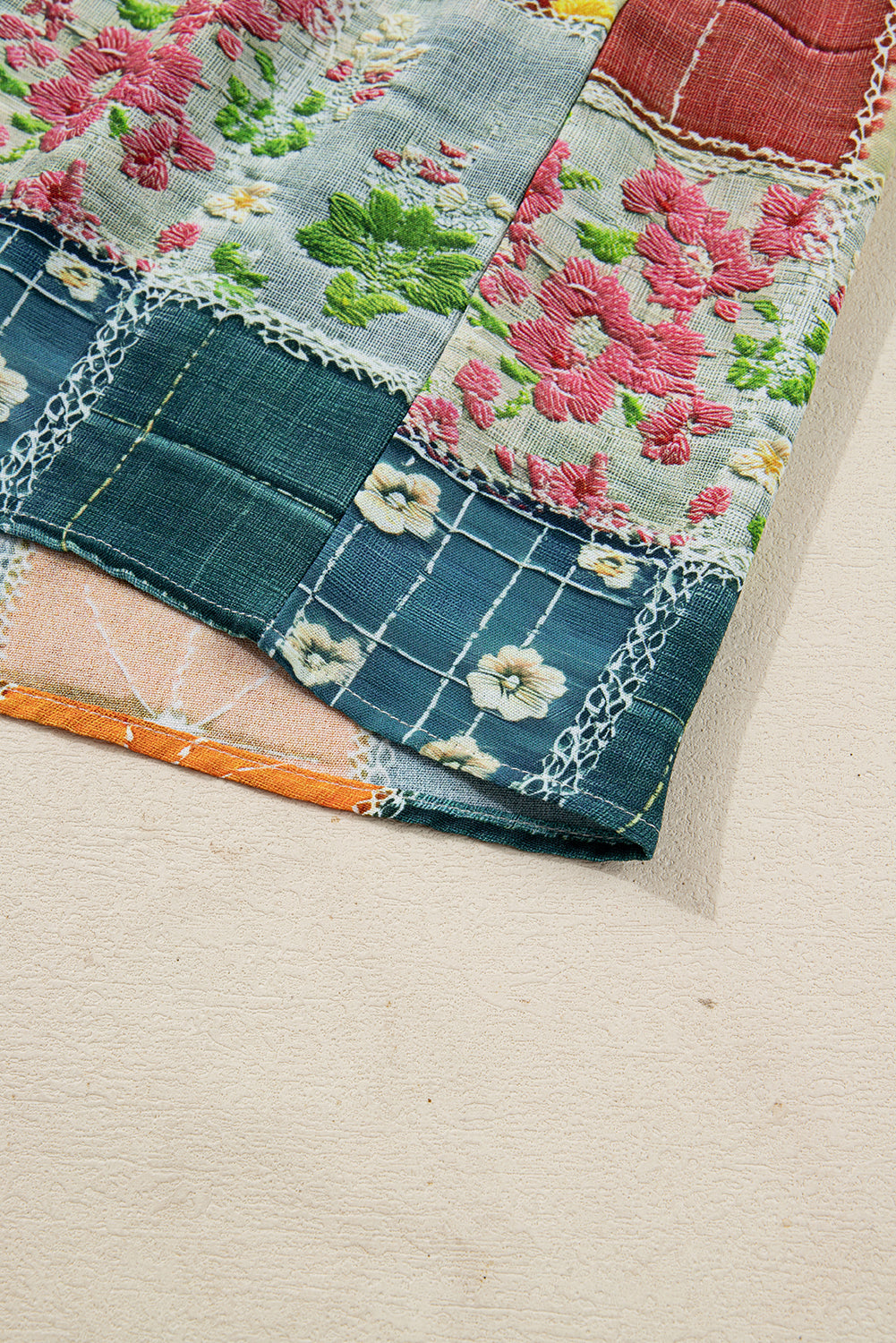 Ruffle hem adds playful movement to this floral checkered mini dress.
