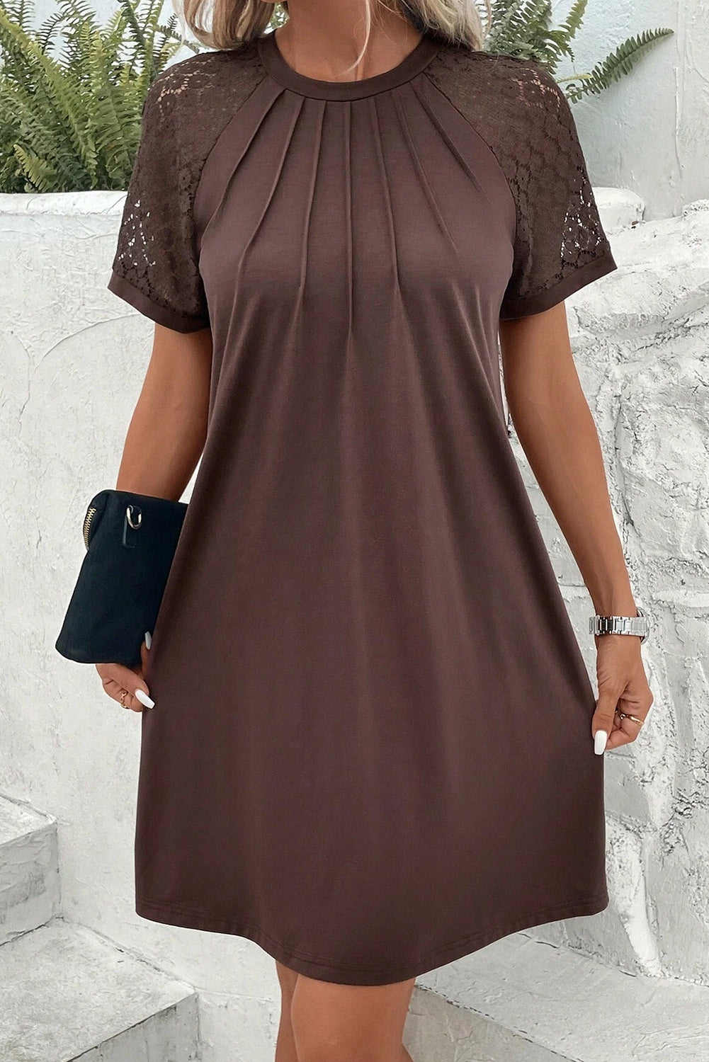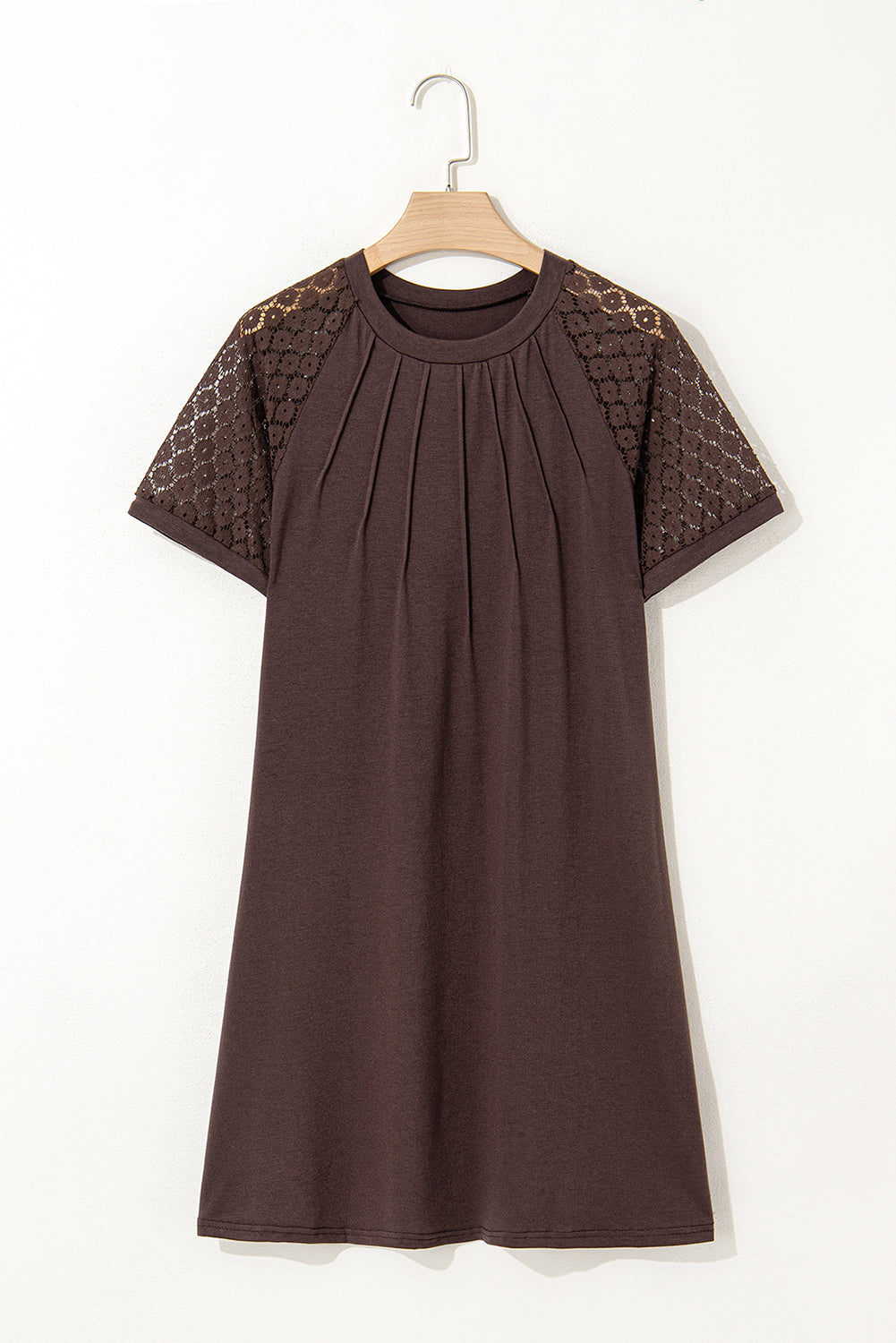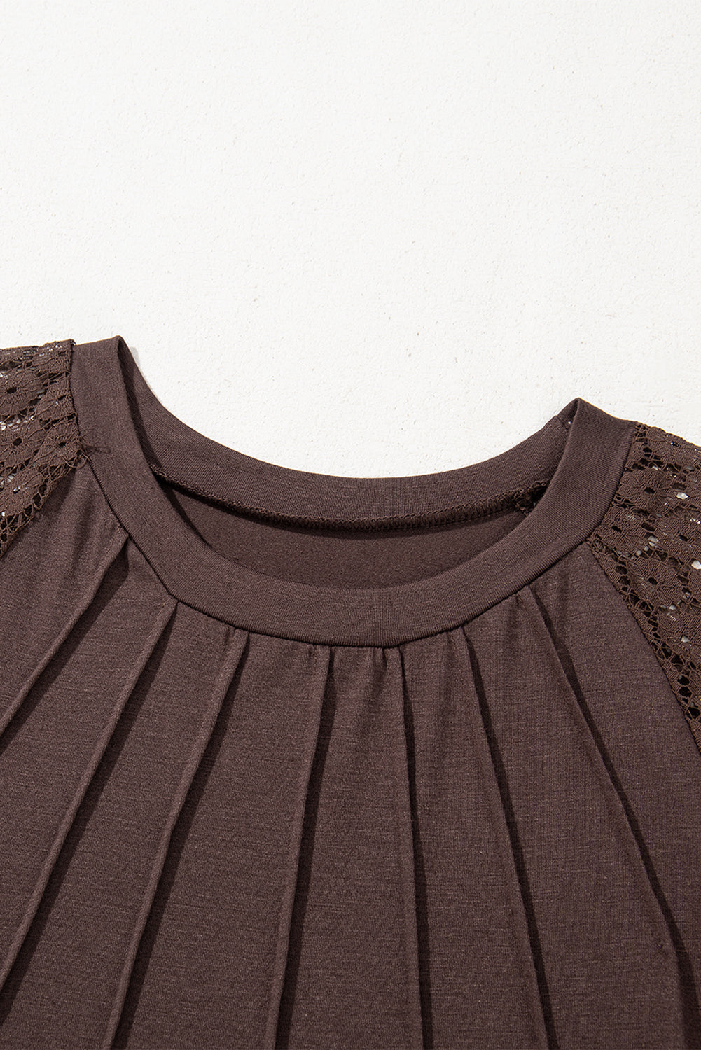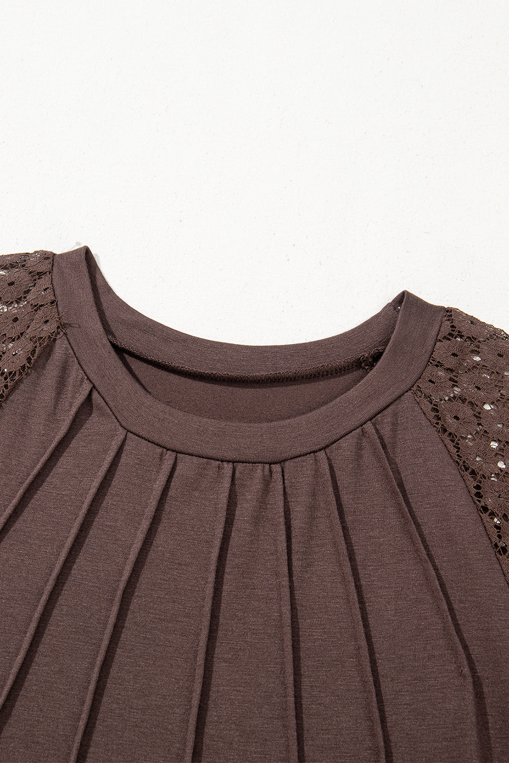 Features pleated details, and lace raglan sleeves.
