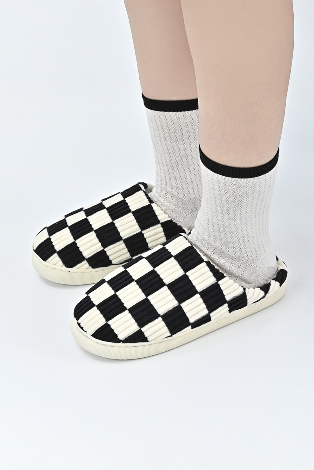 • Black Checkered Print Ribbed Plush Lined Winter Slippers