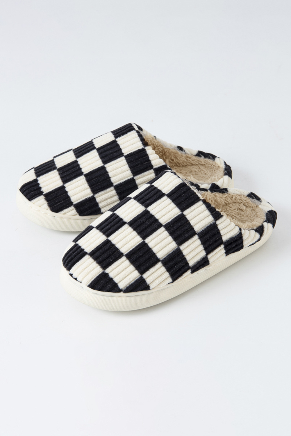 Black Checkered Print Ribbed Plush Lined Winter Slippers