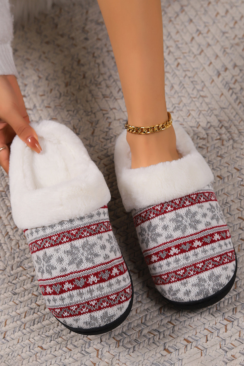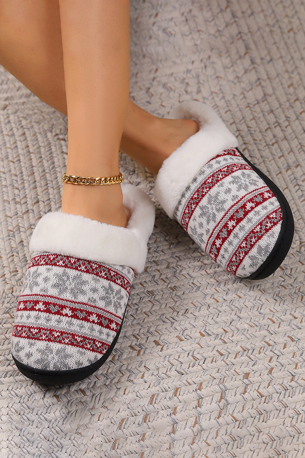 White Snowflake Pattern Knitted Plush Home Slippers